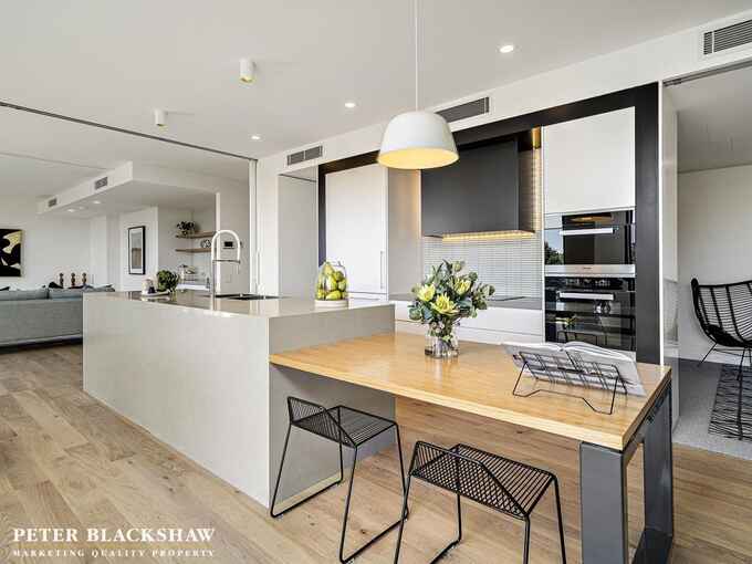 The main suite offers a large superbly finished ensuite with stunning travertine tile flooring and dual robes. The two secondary bedrooms have built-in robes and also open to the balcony space. The huge open plan living areas can be divided to cater for any function or to suit any lifestyle and offer maximum flexibility. There is a third living space which can be used as a media room, hobby room zone or large study which can also be segregated. The kitchen is the heart of the apartment, it features 50mm stone benchtops, an array of Miele appliances, amazing cupboard and bench space and is complemented by the adjoining butler's pantry which is also finished to the highest standard. Externally, the full length balcony takes advantage of the sunny aspect and is ideal for entertaining whilst overlooking Canberra.